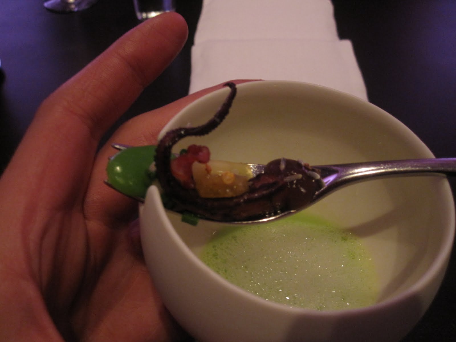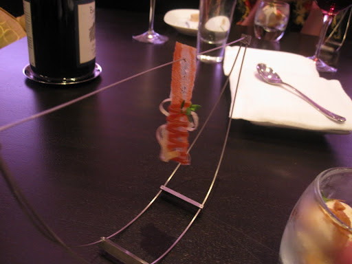 maj 31st, 2010I torsdags var jag och åt på Alinea i chicago. Jag har precis köpt en ny kamera så jag var laddad till tusen. När jag väl skulle börja fota maten så funka den inte, jag fick lite panik men det löste sig. Dom första sakerna vi fick var små coktails i petit four format tre st olika, det var här jag hade som mest panik med kameran och Linda höll på att skämmas ihjäl tyvärr har jag inget kort på dem men allt kom in på tre små fat.