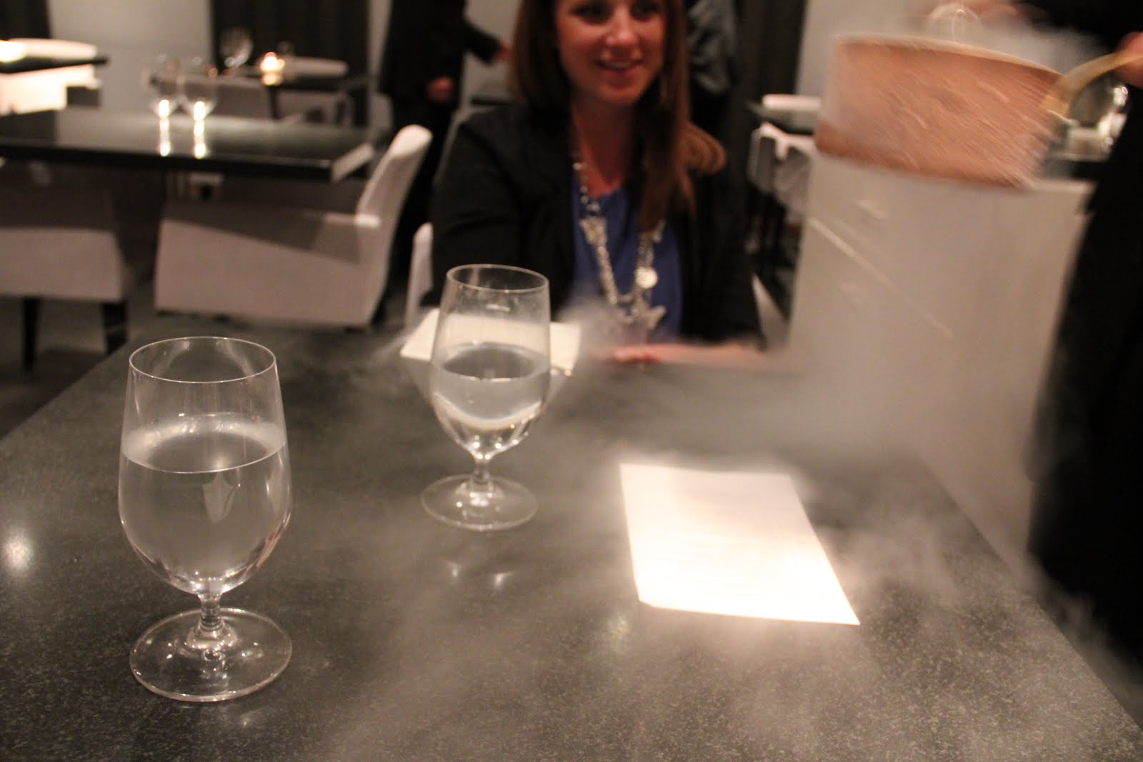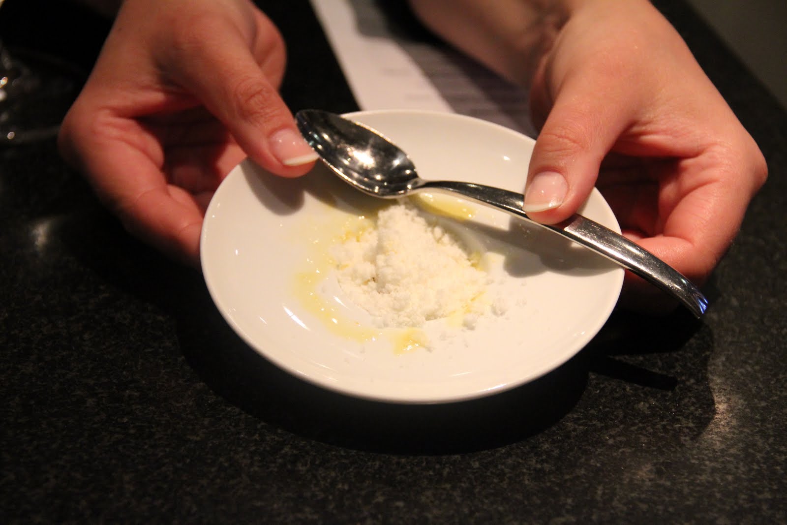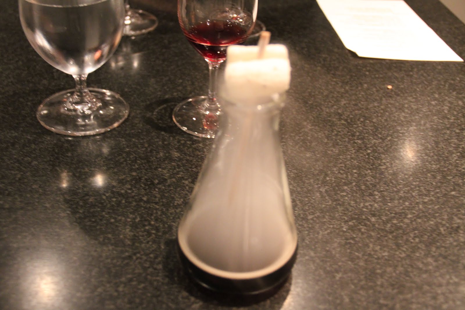 Pina colada cereal. Svårt att se av all rök på bilden men det var ananas och kokos som blandas i flyttande kväve riktigt gott och det är alltid kul när det ryker. Linda ser ut som ett litet barn på alla bilder med rök så roligt att se 🙂
